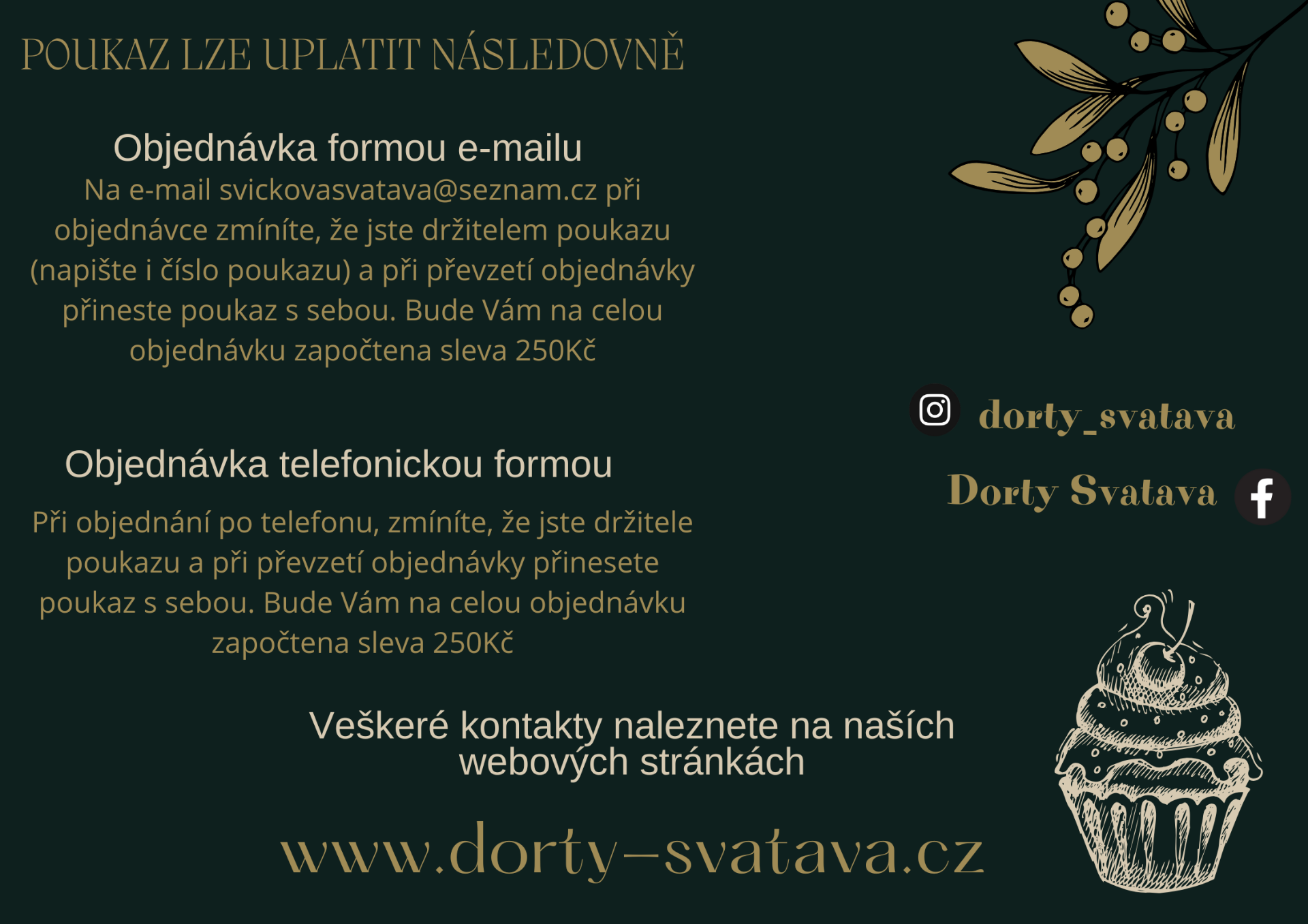Na e-mail svickovasvatava@seznam.cz při objednávce zmíníte, že jste držitelem poukazu (napište i číslo poukazu) a při převzetí objednávky přineste poukaz s sebou (nebo jej mějte přichystaný v mobilu) . Bude Vám na celou objednávku započtena sleva 250Kč